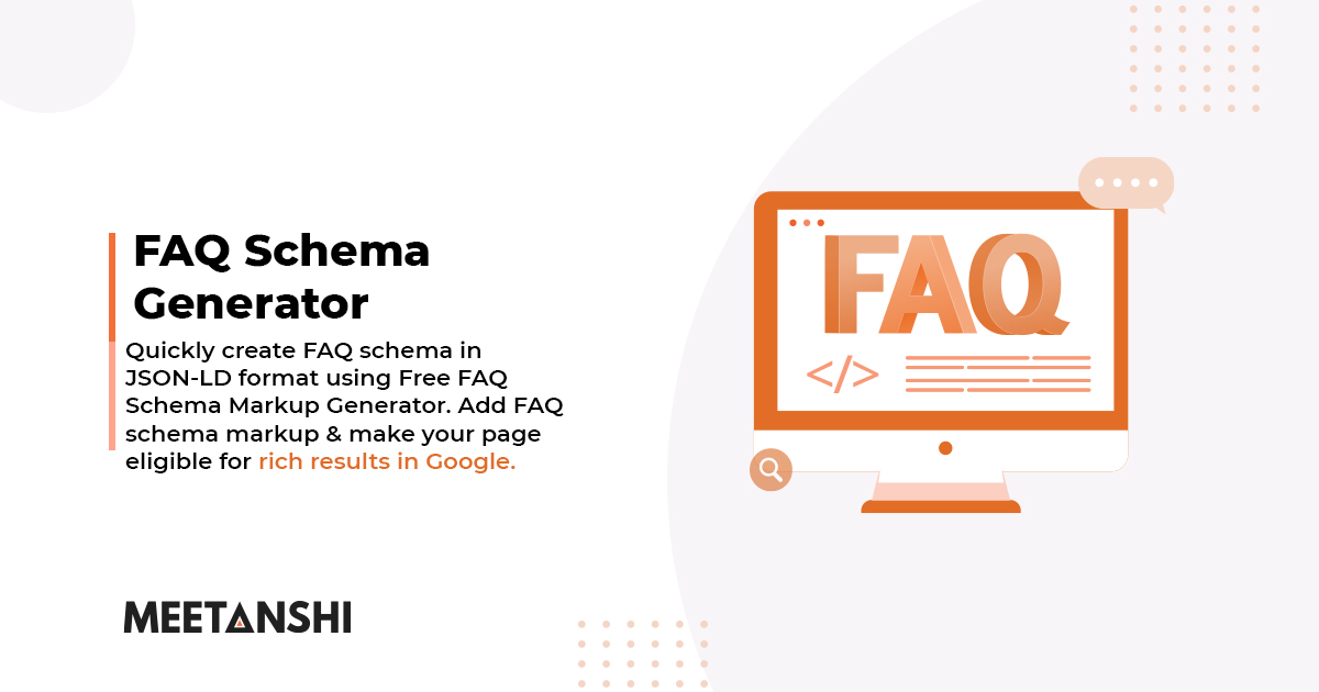 Meetanshi's FAQ Schema Generator is a tool that helps website owners to create and implement FAQ (Frequently Asked Questions) schema on their website. This schema is a form of structured data that can be added to a website's HTML code, which allows search engines to understand the content of the FAQ page and display it in a more user-friendly format in search results.
